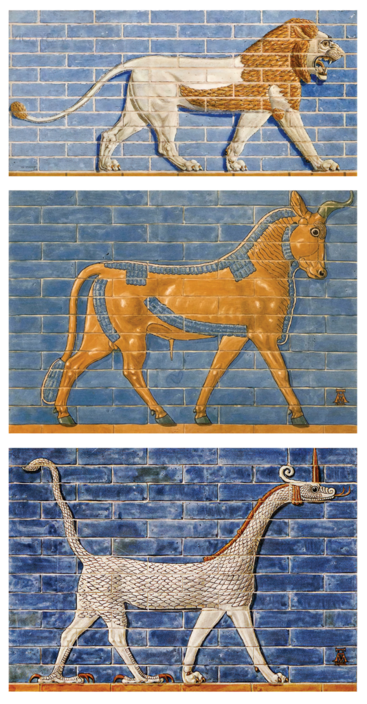 “The animals represented on the gate are young bulls (aurochs), lions, and dragons (sirrush). These animals are symbolic representations of certain deities: lions are often associated with Ishtar, bulls with Adad, and dragons with Marduk. Respectively, Ishtar was a goddess of fertility, love, war, and sex, Adad was a weather god, and Marduk was the chief or national god of Babylon.”