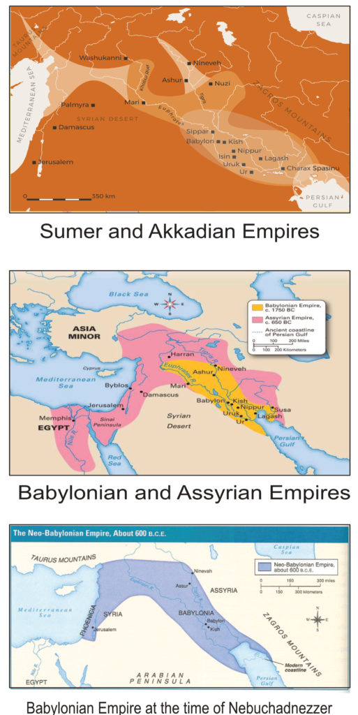 Taking these maps top to bottom we start with Sumer in the lighter shade with the cities of Babylon, Uruk, Eridu, Nippur, and others. Also, you see the cities of Nineveh, Ashur, Akkad, and others further north which were built by Nimrod after the more southern cities were established. The darker shaded areas are the expansion of the population that came under the rule of the Akkadians. The timeline is Sumer first, then came the Akkadians with Sargon Ī and conquered the area some 200 years after Sumer is established. Then the third dynasty of Sumer after the Akkadians. On the second map, you see the Old Babylonian era along with the rise of the Assyrian empire. In the bottom map is the Babylonian empire at the time of Nebuchadnezzar, around 600 BCE.