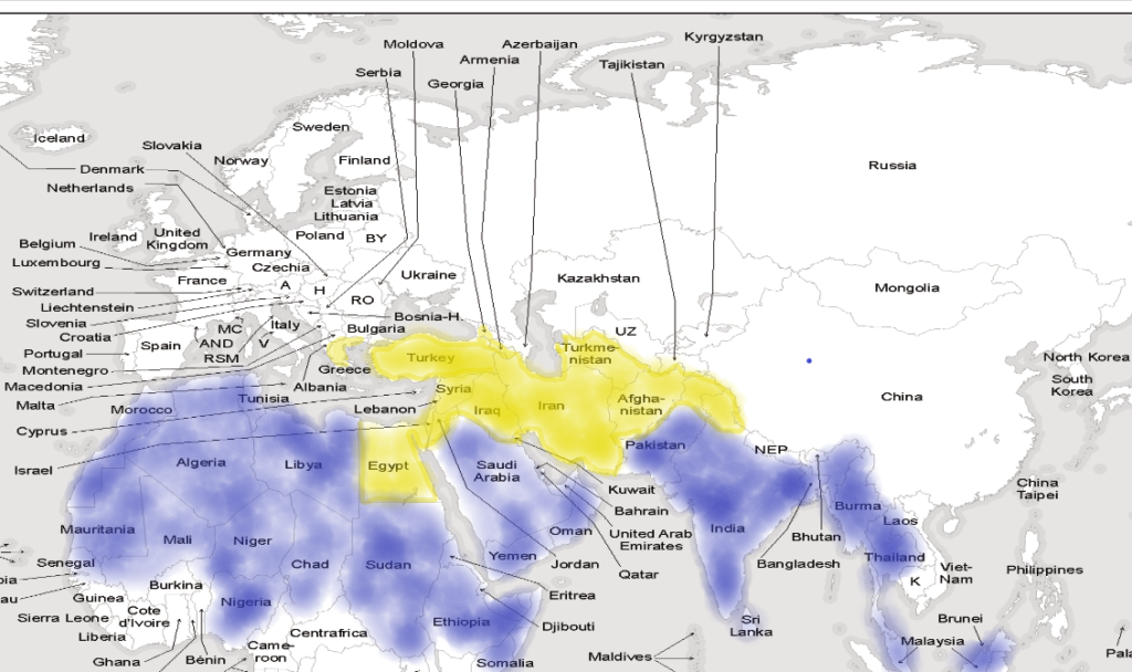 The yellow areas are the modern-day countries that are defined by the body of the beast. The blue areas are what are likely to be added to his full domain if he were to come to power in this generation.