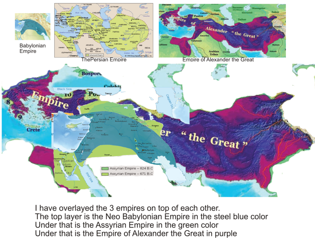 The top three maps do not scale out perfectly with each other however you can see the relative size of the Babylonian Empire compared to the Persian Empire compared to the Empire of Alexander the Great.