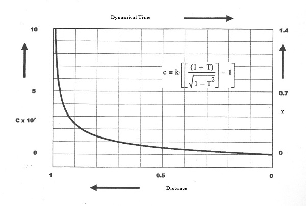 - Light Speed vs. Time: Shown on the left-hand and upper axes. The left-hand axis measures light speed in terms of ten million times ‘c’ (the current speed of light), while the upper axis corresponds to time.